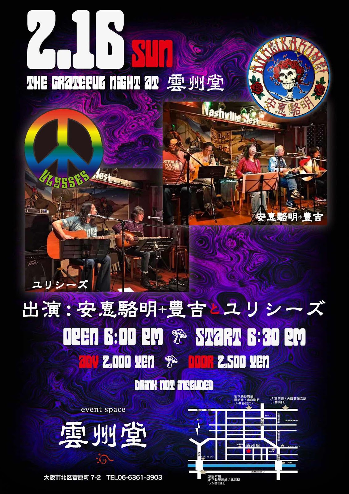 16日の日曜日は南森町の風情溢れまくり、料理も酒も美味しい雲州堂にて今年初のアコギでロック、Ulysses!大好きなdeadheads、安惠駱明とご一緒します。