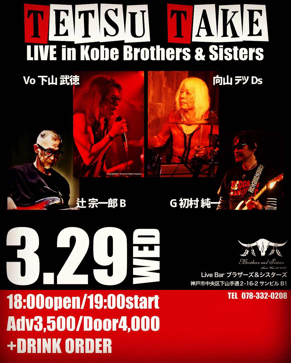 3/29の水曜日、神戸三宮のブラシスでテツタケでギター弾きます。