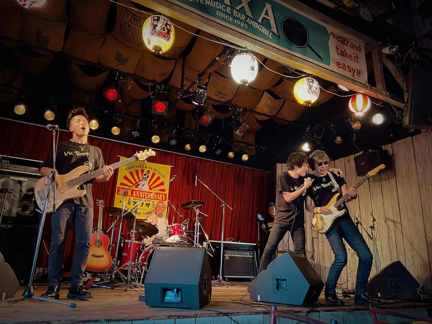 Mr.Boots @マクサ夏祭り、ベースにマシュー、ドラムに氏永が加わって初めてのバンド編成。客席も板の上もむっちゃ盛り上がりました。間慎太郎はロックンロールシンガーやなぁ。ありがと〜!マクササイコー^_^!